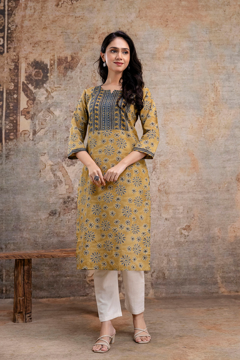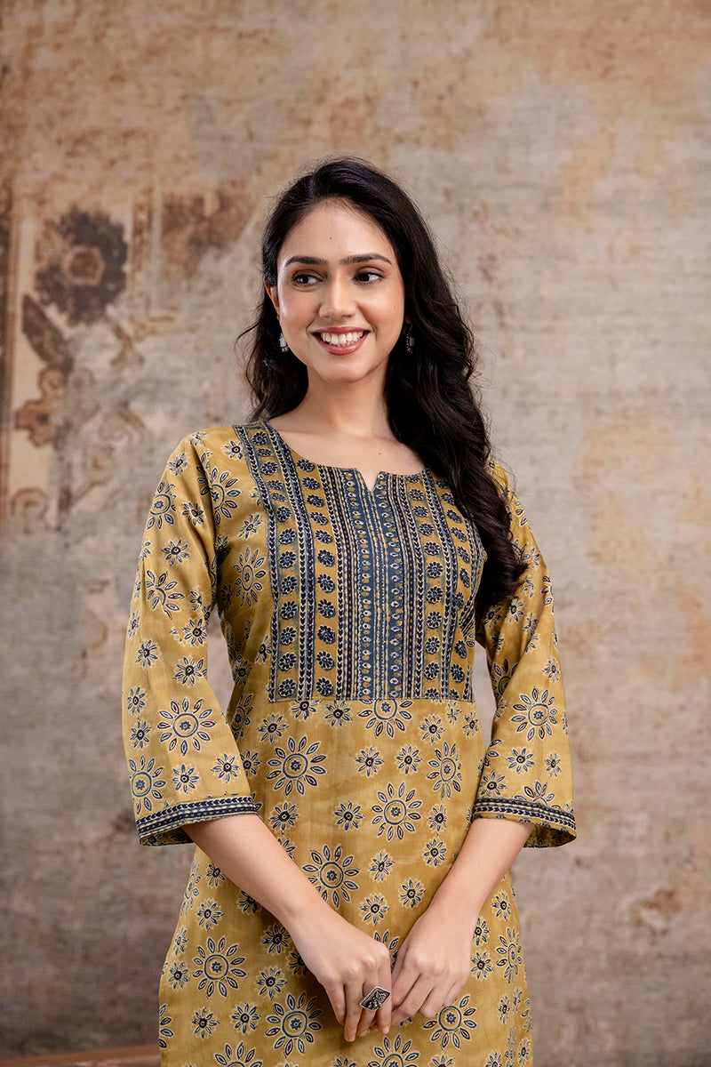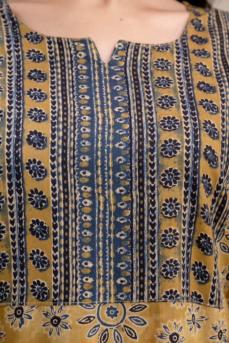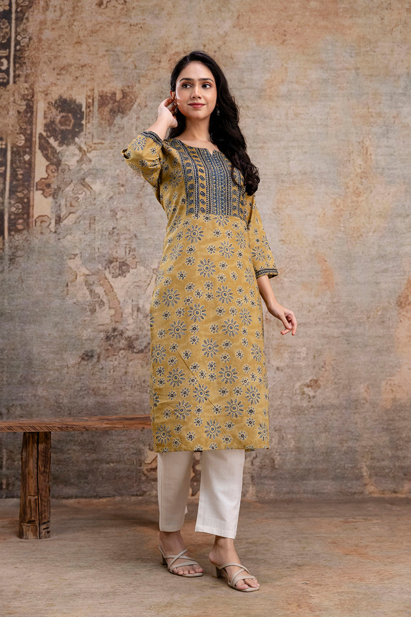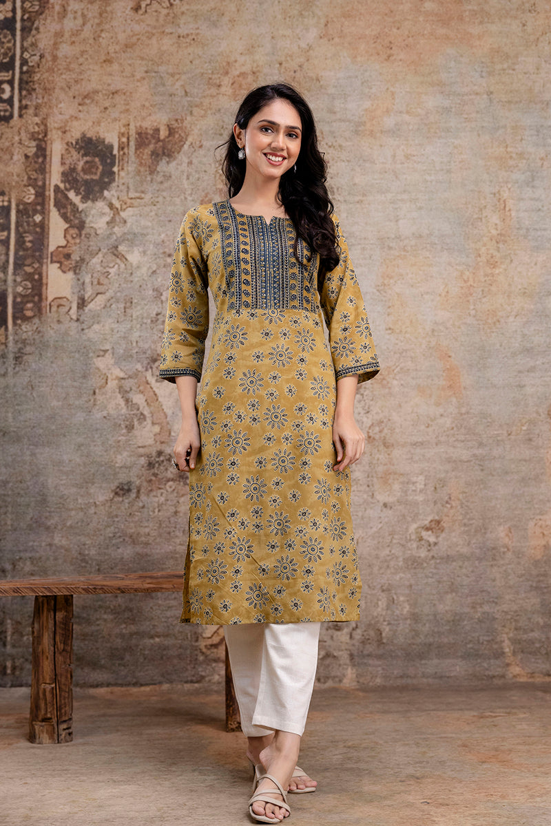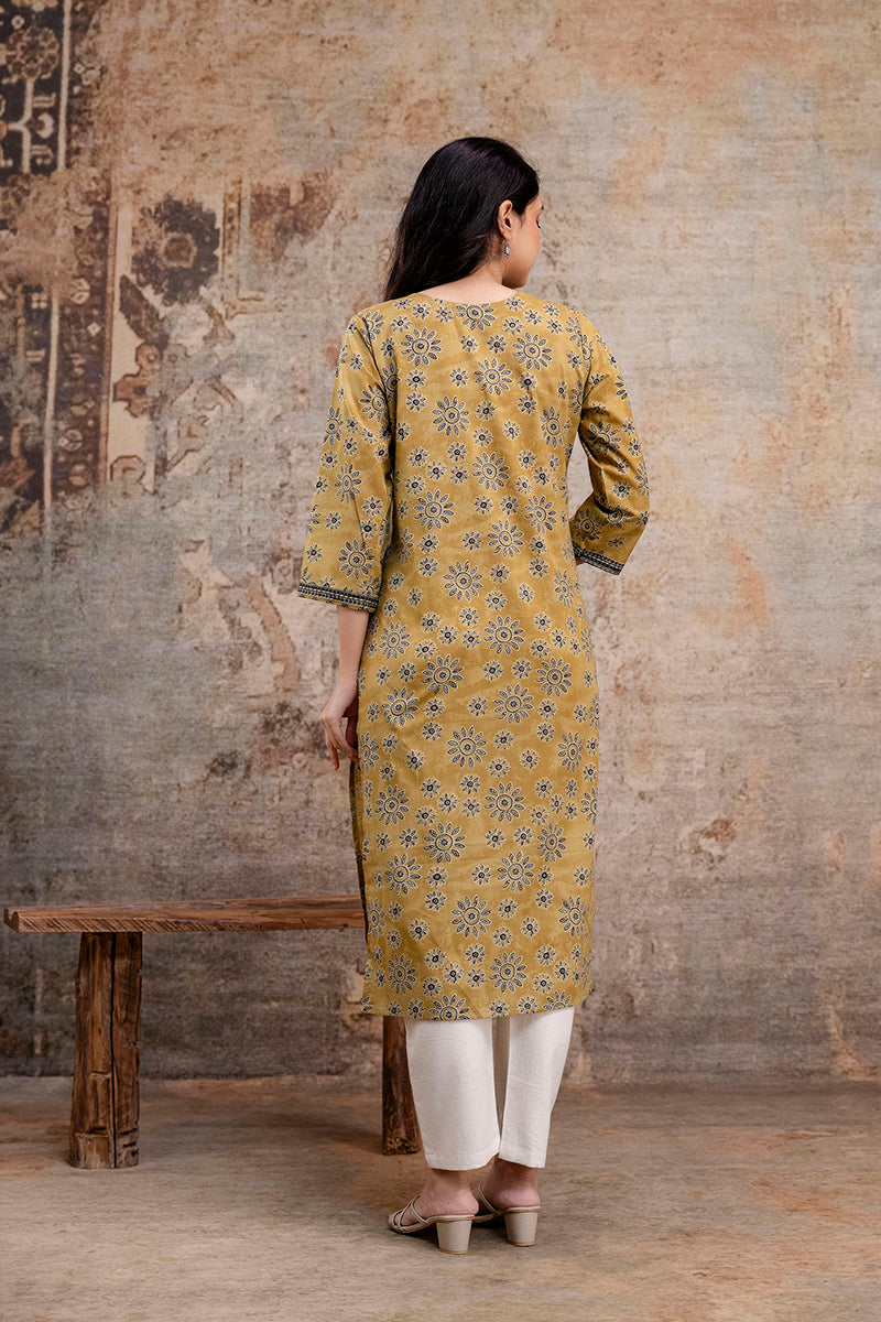Anvi Mustard Yellow Straight Cotton Kurti – Floral Block Print Ethnic Wear